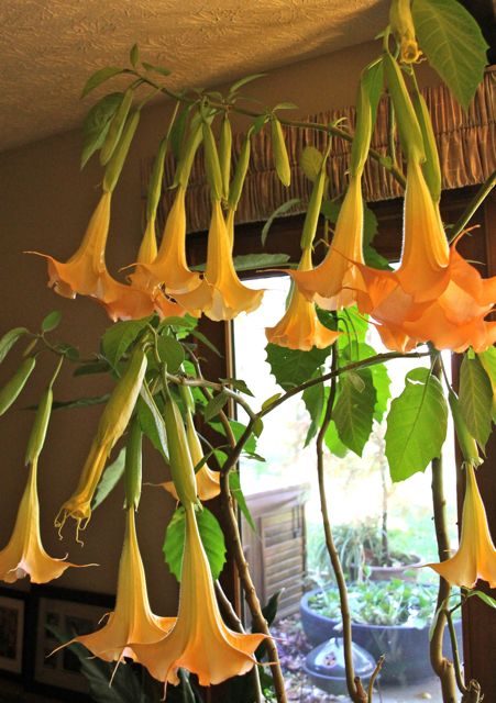 I have a perfume factory in my family room. The fragrance? Brugmansia. LOTS and LOTS of Brugmansia. It is also known as Angel’s Trumpet. This 7-foot tree like plant was one of the last plants I brought in from outside for the winter. It proceeded to thank me for saving its tender tropical life by dropping its leaves. Five to ten a day. You can hear them: plop, plop, plop.