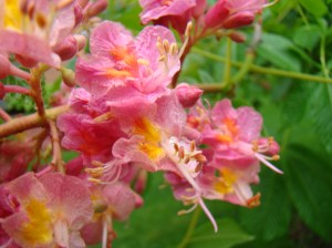 Every spring I look forward to seeing my beautiful pink buckeye tree (Aesculus x hybrida) bloom. I remember purchasing it as a commemoration of our 20th wedding anniversary. It was just a little guy back then. It is about 15 feet tall and every branch tip is capped off with these gorgeous floral clumps – perfect celebration for our 35th anniversary!