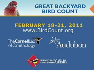 The 2011 Great Backyard Bird Count (GBBC) will take place Friday, February 18, through Monday, February 21. The Great Backyard Bird Count is an annual four-day event that engages bird watchers of all ages in counting birds to create a real-time snapshot of where the birds are across the continent. Anyone can participate, from beginning bird watchers to experts. It takes as little as 15 minutes on one day, or you can count for as long as you like each day of the event. It’s free, fun, and easy—and it helps the birds. Participants count birds anywhere for as little or as long as they wish during the four-day period. They tally the highest number of birds of each species seen together at any one time. To report their counts, they fill out an online checklist at the Great Backyard Bird Count website. Go to http://www.birdsource.org/gbbc/whycount.html for more information.
