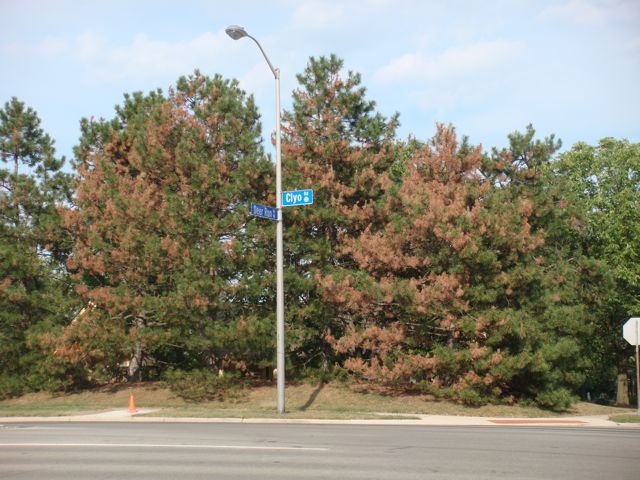 According to the ODNR’s Division of Forestry the Austrian pine is the pine most susceptible to Diplodia Tip Blight, a fungus that commonly attacks mature trees that have been stressed. And these trees have seen stress! This menace will slowly kill the tree over several years and wreak havoc in mass plantings as it spreads to surrounding trees. If it was present last year, I must have been oblivious. THIS year….. it is everywhere. Just drive down Clyo Road around Alex-Bell. Or check out I-675 between the Centerville and Wilmington Pike exits. I what I see from my car is any indication, we’re on track to soon lose thousands of pine trees.